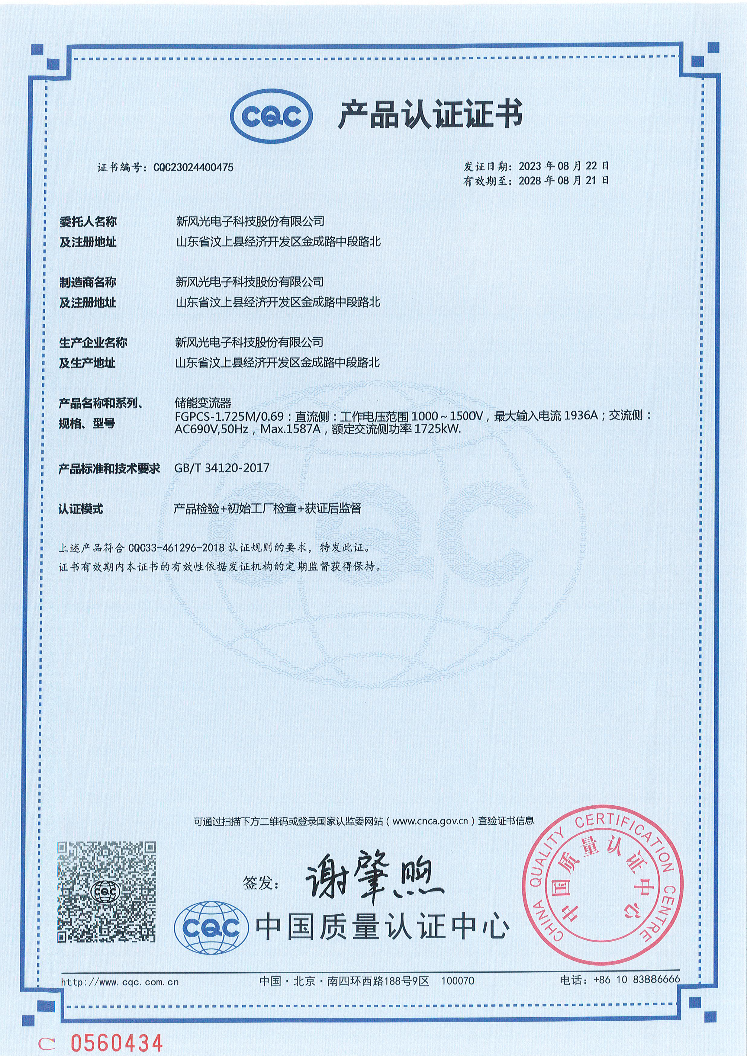 FGPCS-1.725M0.69儲(chǔ)能變流器CQC認(rèn)證證書(shū)
