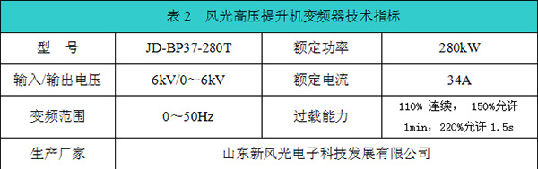 風光高壓提升機變頻器為可以四象限運行的能量回饋型變頻器,采用較先進的矢量控制技術,加速時可以實現(xiàn)較大的轉(zhuǎn)矩輸出,加速時間縮小至較短,而減速時,可以控制電機在四象限運行,輸出制動轉(zhuǎn)矩,減速時間縮至較短,同時,將勢能轉(zhuǎn)化為電能,回饋至電網(wǎng),從而達到節(jié)能的目的。風光高壓提升機變頻器具體參數(shù)如表2所示。