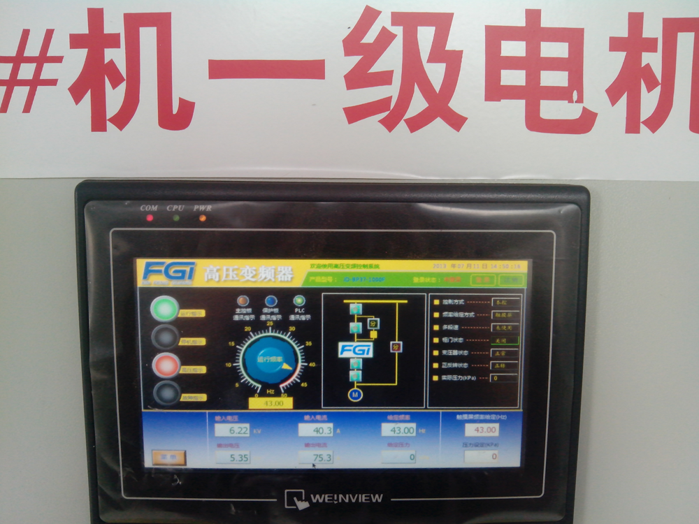 焦家寨煤礦通風機選用JD-BP37-1000F風光變頻器4套,于2013年7月2日變頻器一次性投運成功,至今運行正常。變頻運行后,風門全部打開,用戶根據所需風量風壓實時調節(jié)變頻器頻率,進而調節(jié)通風機運行工況。不僅完全滿足煤礦生產工藝要求,而且用戶操作非常方便?,F場調試中發(fā)現,1#風機的前后兩級電機采用高壓變頻器分別獨立控制,可以有效避免喘振現象?,F場測試1#風機有關數據如下。一級電機運行參數,運行頻率:43Hz,變頻輸入電流:40.3A,輸入電壓:6.22kV,輸出電壓:5.35kV,輸出電流:75.3A;二級電機運行參數,運行頻率:39Hz,變頻輸入電流:45.3A,輸入電壓:6.31kV,輸出電壓:4.92kV,輸出電流:76.5A。人機界面現場照片如圖4所示。
