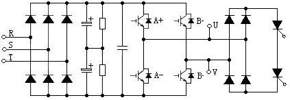 每個(gè)功率單元結(jié)構(gòu)上完全一致,可以互換,其主電路結(jié)構(gòu)如圖所示,為基本的交-直-交雙向逆變電路,圖中通過(guò)逆變塊IGBT反并聯(lián)的二極管構(gòu)成三相全橋方式整流,整流后的給濾波電容充電,確定母線電壓, 通過(guò)對(duì)IGBT逆變橋進(jìn)行正弦PWM控制實(shí)現(xiàn)雙向逆變。