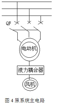 原系統(tǒng)主電路如圖4示,原系統(tǒng)電網(wǎng)通過真空斷路器直接進(jìn)電機(jī),采用液力耦合器進(jìn)行調(diào)速。