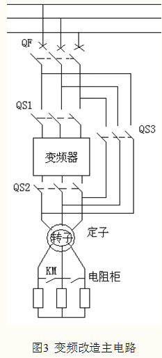 變頻改造后的系統(tǒng)主電路如圖3示,從變頻器的輸入隔離開關(guān)QS1、輸出隔離開關(guān)QS2各取一對動斷觸點串入電阻柜內(nèi)接觸器KM的合閘回路,保證變頻啟動時切除電阻啟動。