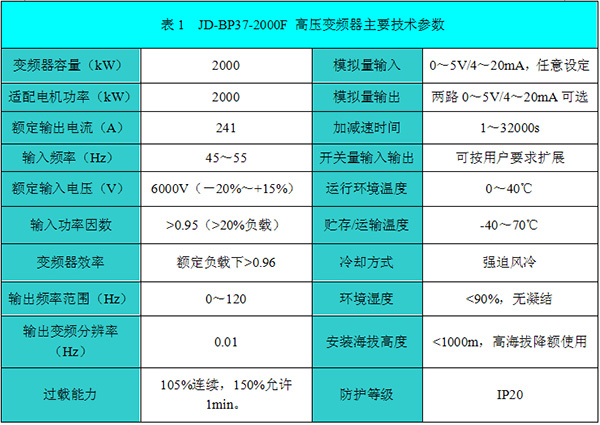 JD-BP37-2000F高壓變頻器技術(shù)參數(shù)如表1所示。