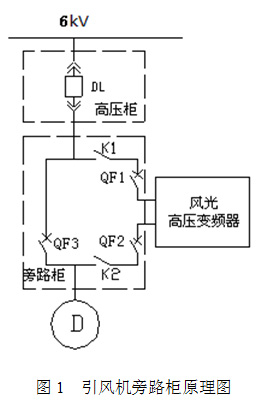 旁路柜主要配置:三個真空斷路器(QF1、QF2、QF3)和兩個刀閘隔離開關(guān)K1、K2。QF2與QF3實現(xiàn)電氣互鎖,當(dāng)QF1、QF2閉合,QF3斷開時,電機變頻運行;當(dāng)QF1、QF2斷開,QF3閉合時,電機工頻運行。另外,QF1閉合時,K1操作手柄被鎖死,不能操作;QF2閉合時,K2操作手柄被鎖死,不能操作。