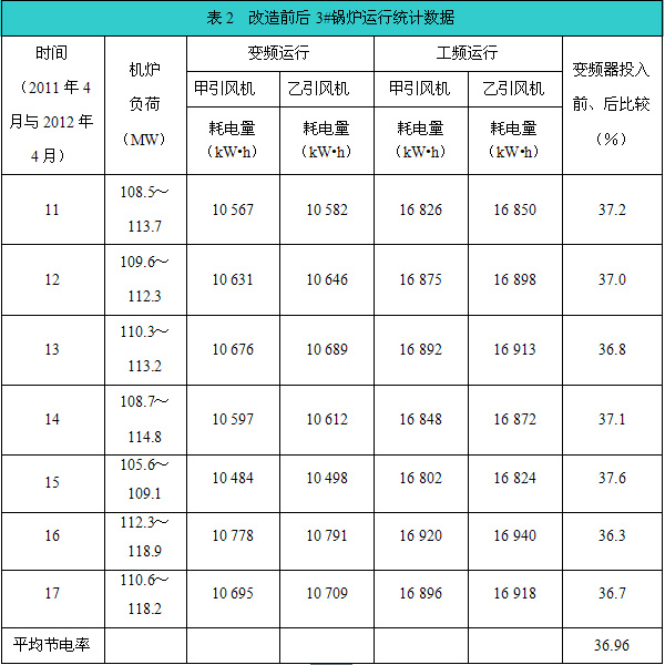 引風(fēng)機變頻改造工程于2012年1月一次成功投運,改造達(dá)到了預(yù)期目的。以下是3#機組甲、乙引風(fēng)機高壓變頻器運行后,對改造前2011年4月11日至17日與改造后2012年4月11日至17日機組生產(chǎn)數(shù)據(jù)進行比較,負(fù)荷基本相同,改造前后3#鍋爐運行統(tǒng)計數(shù)據(jù)如表2所示。