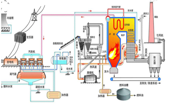 電廠主要組成:風(fēng)系統(tǒng)、燃料輸送系統(tǒng)、給水蒸汽系統(tǒng)、冷卻系統(tǒng)。鍋爐是一個換熱器,主要由爐膛、水冷壁、過熱器、省煤器、空氣預(yù)熱器組成。