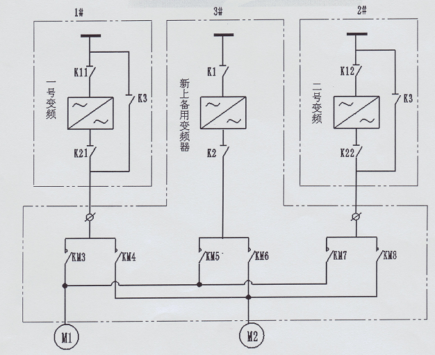 1#和2#是原來兩套變頻器系統(tǒng),3#是新上備用變頻器。正常情況下KM3,KM8吸合,1#和2#變頻器分別驅(qū)動兩臺電機(jī)。假如1#變頻器出現(xiàn)故障,KM3交流接觸器斷開,KM5吸合。3#變頻器以飛車啟動模式把電機(jī)帶起來,不影響生產(chǎn)。假如2#變頻器出現(xiàn)故障,KM8交流接觸器斷開,KM6吸合,3#變頻器以飛車啟動模式把電機(jī)帶起來。把故障變頻器維修好后,給3#備用變頻器切換信號,3#變頻器輸出交流接觸器KM5或KM6斷開,原來對應(yīng)的接觸器吸合,維修后的變頻器以飛車形式啟動。同樣,如果開始投入的是2#和3#變頻器,其中的一臺出現(xiàn)故障,也可以切換到1#變頻器上。實現(xiàn)了1#,2#、3#三臺變頻器之間的任意切換。