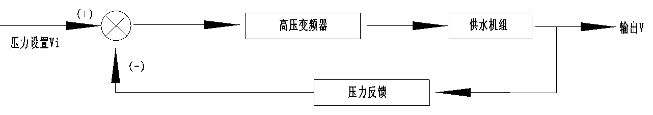 為滿足不同時段不同地區(qū)的用水壓力需求,該水廠采用先進(jìn)的恒壓供水控制系統(tǒng),可以對水廠出口處的水壓值V進(jìn)行精確的處理和控制,并與壓力設(shè)置值Vi構(gòu)成閉環(huán)控制系統(tǒng)。恒壓供水系統(tǒng)原理如圖2所示。變頻器內(nèi)部的主控DSP采集供水壓力值V與用戶給定值Vi進(jìn)行比較和運算,通過PID進(jìn)行調(diào)整,將結(jié)果轉(zhuǎn)換為頻率調(diào)節(jié)信號送至變頻器,直至達(dá)到供水壓力的給定值Vi。不管系統(tǒng)供水流量如何變化,供水壓力值V始終維持在給定壓力值Vi附近。