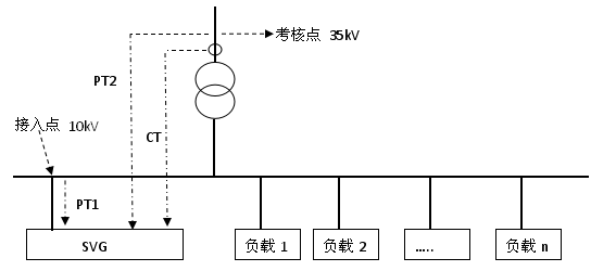 現場采用降壓式接入方式,10kVSVG通過變壓器接入35kV電網,考核點在35kV側,SVG通過并網變壓器接入電網,變壓器接入點與考核點相同。如圖3所示。PT信號連接到PT1,并且二次接線端子PTA1與接入點電網一次端 子A必須是同一相;PTB1與接入點電網一次端子B必須是同一相,PTC1與接入點電網一次端子C必須是同一相。PT1用于SVG計算并網同步信號,還用于計算考核點處的無功。
