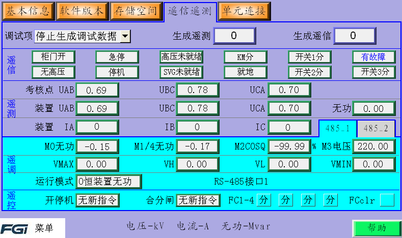 現場與后臺的通訊調試主要是SVG與后臺的信號與操作命令的傳輸。包括SVG傳給后臺的遙信、遙測信號以及后臺控制SVG的遙調、遙控指令。可通過人機界面的“信息查詢”/“遙信遙測”界面模擬生成數據,每個地址里生成不同的數據,在界面上觀測看到的數據是否與生成的一致進行對比調試。如圖4所示。