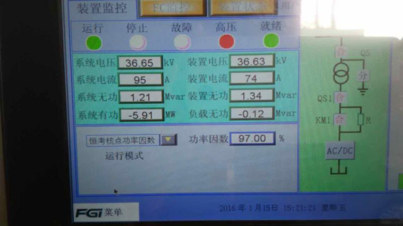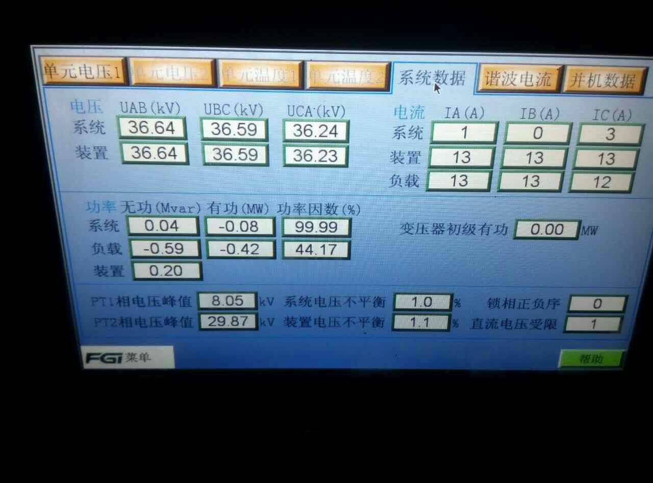 617-2011要求“大中型光伏電站應配置無功電壓控制系統(tǒng),具備無功功率及電壓控制能力。根據電力調度部門指令,光伏電站自動調節(jié)器發(fā)出(或吸收)無功功率,控制光伏電站并網點電壓在正常運行范圍內,其調節(jié)速度和控制精度應能滿足電力系統(tǒng)電壓調節(jié)的要求。低電壓穿越過程中光伏電站宜提供動態(tài)無功支持?!薄禛B/T29321-2012光伏發(fā)電站無功補償技術規(guī)范》中5.2條款要求,“光伏電站無功補償裝置應能夠跟蹤光伏電站處理的波動及系統(tǒng)電壓控制要求,并快速響應。動態(tài)無功響應時間應不大于30ms。”該光伏電站業(yè)主通過招標方式,選擇了新風光生產的FGSVG-3.0/35T-O型高壓動態(tài)無功補償和諧波治理裝置,配置在光伏發(fā)電現場,用于電網無功補償和諧波治理,設備一次成功投運,達到了預期目的。