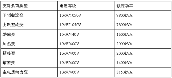 上輥整流變以及下輥整流變支路為軋機主動力電機支路,主要提供軋機上下棍直流電機的供電,供電方式為12脈沖整流供電,上下棍咬鋼過程中瞬間功率迅速大幅度提高,同時12脈沖整流電路會產(chǎn)生11、13次諧波成分。輔整變和精整變支路為三相6脈沖整流電路,功率輸出過程產(chǎn)生部分5、7次諧波電流。整個生產(chǎn)過程各負荷支路協(xié)同運行,對于電網(wǎng)造成明顯的功率沖擊和諧波污染。